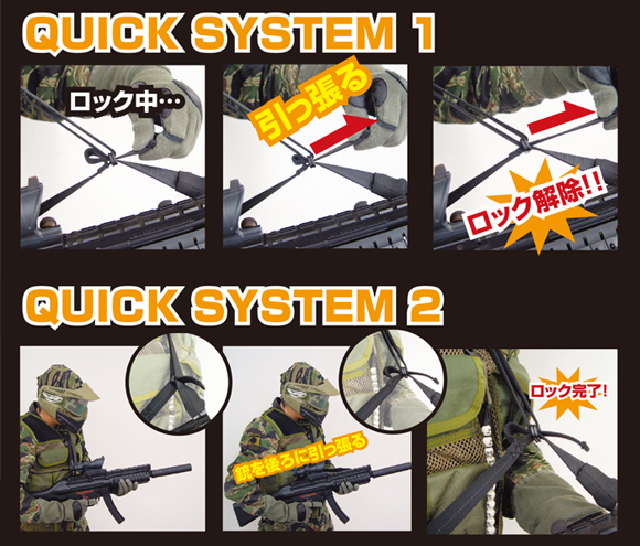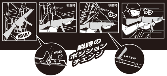 ●移動用ポジションから、射撃姿勢への移行はスリングの一部を引っ張るのみ!簡単にスリングのロックをはずす事が可能です。