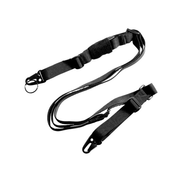 ●3点式スリング:身体にフィットする3点式スタイルから、ワンタッチで射撃ポジションに移行可能です。ジョイントのロックを外すだけで、射撃ポジション用の1点式スタイルとなります。