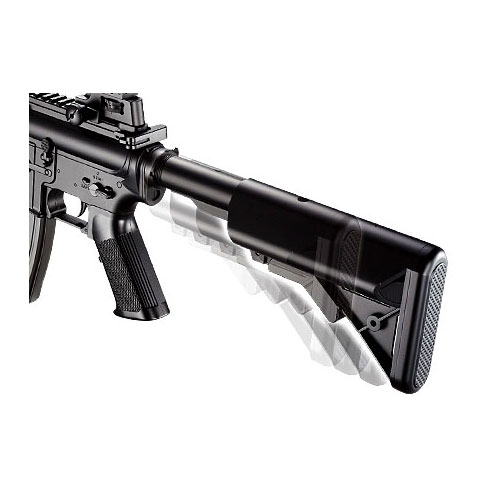 ●リアルなディテール:M4A1をベースに、最新のスタイルをリアルに再現。18mm幅のマウントレイルを備えたハンドガードに、こまかい調整が行えるリアサイト、そして伸縮可能なストックなど、18才以上用電動ガンに匹敵するリアルさです。