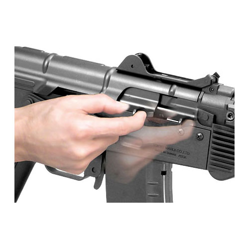 ●フル/セミオート切替式:ボディ側面のセレクターを操作するだけで、フルオート発射とセミオート発射を切り替えることができます。※コッキングハンドルを引いてコッキングした場合は、単発での発射となります。