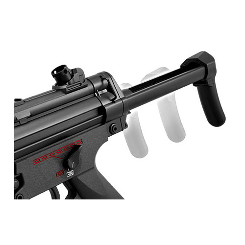 ●リアルな実物スケール:本物と同じ1/1スケールでMP5A5のR.A.S.(レイルアダプター・システム)モデルを再現。コッキングレバーを引いてのコッキングや、長さを3段階に調整できるストックといったギミックも再現しています。