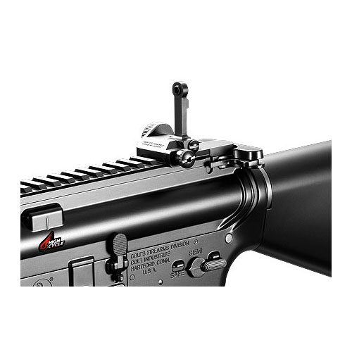 ●CRWカスタム:各種オプションパーツ搭載のためのマウントレール(幅20mm)を4面に配したアルミダイカスト製レイルハンドガードを採用し、バレル長をギリギリまでカットダウン。また、キャリングハンドルを排してドットサイト搭載に適した脱着式リアサイトを搭載。拡張性高く取り回しやすいモデルとなっています。