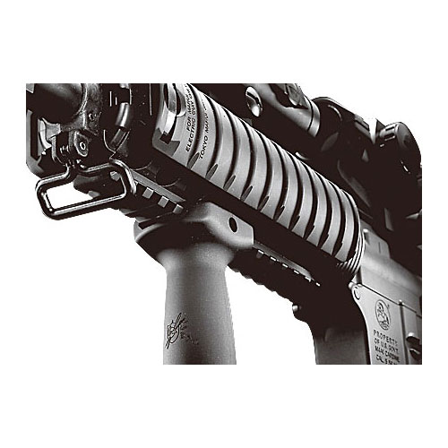 ●金属製R.I.S.を装備:幅20mmのマウントレイルを4面に配した剛性の高いアルミダイカスト製のR.I.S.に、バーチカル・フォアグリップとレイルカバーが付属します。