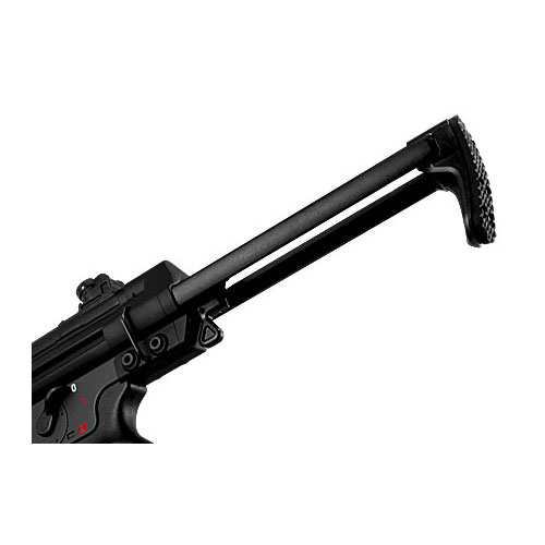 ●スライドストック:ストックはレバー操作ひとつで伸縮が可能です。狭い場所でも取り回しのよい625mmから、しっかり構えてねらえる806mmへと全長が変化します。本体両サイドを挟み込むようストックの支柱を金属製にしたことで、ストックをのばした時の剛性も確保しています。