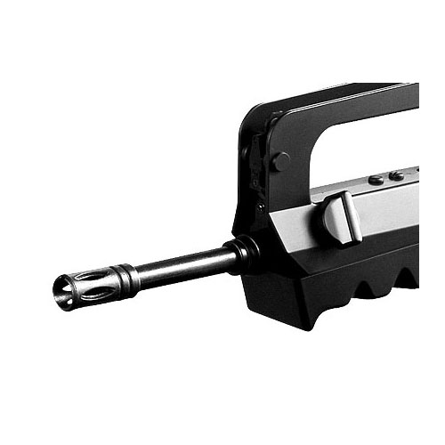 多くのアサルトライフルはバレルをカットして小型化をはかりますが、ブルパップタイプのアサルトライフルはバレルごと機関部を後ろに引っ込ませているため、バレルの長さ(命中精度)に影響をあたえることなく小型化することができます。また、射手に近い位置に重心があるため重量バランスに優れ、発射時のコントロールも容易です。取り回しやすさを考慮した理想的な設計と言えるでしょう。