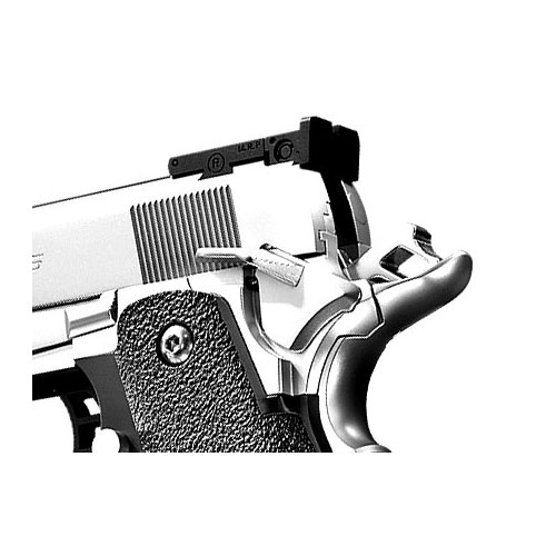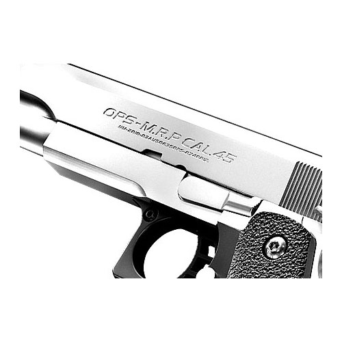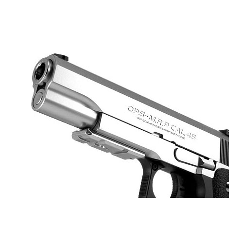 ガバメント唯一の弱点である装弾数の少なさをマガジンのダブルカラム(複列弾倉)化でカバーし、大型のマガジンをすっきりと収納するため、フレームはポリマー(樹脂)製グリップと金属製シャーシを組み合わせたスリムなスタイルとなっています。スライドには重量弾「.45ACPミリタリーボール+P」への対応を想定した角型ヘヴィタイプを採用。また、ピカティニー規格(20mm幅)のアンダーレイルが付属し、各種フラッシュライトを装着可能なタクティカルスタイルと、レイルレスのスポーツスタイルを選択可能なオールマイティモデルとなっています。
