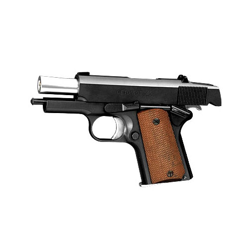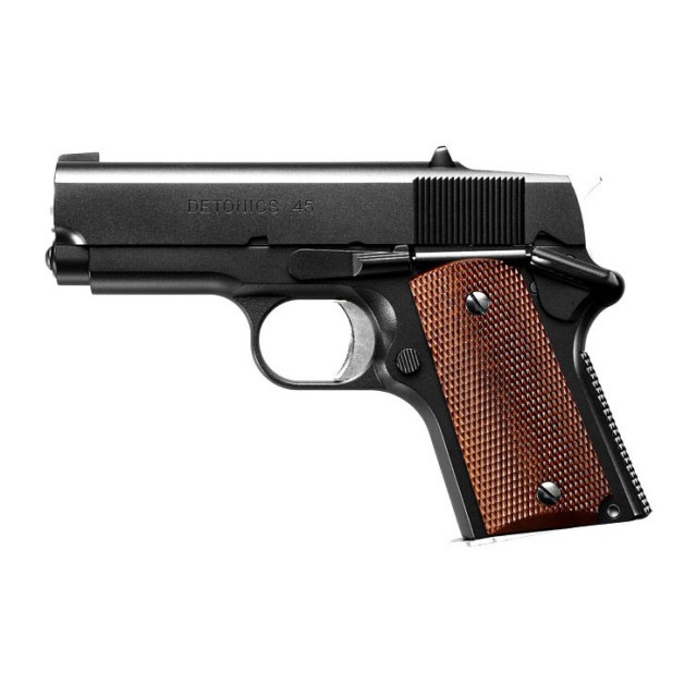 デトニクス.45のモデルとなったのは、デトニクス社の「コンバットマスター MC-1モデル」です。ブルーイング・フィニッシュが施され、ユニークな姿をした全長178mmの極小モデルには、サブ・コンパクトサイズのカスタムガバメントの流れを決定づける数々の工夫が盛り込まれています。