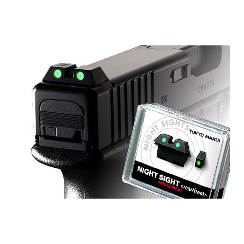 ●ナイトサイト付属:本体に組込まれているノーマルタイプのフロント/リアサイトに加え、蓄光タイプのナイトサイトを同梱。ドット部分をライトで照射することにより、ドットに使用した蓄光性夜光顔料が光を吸収して発光します。