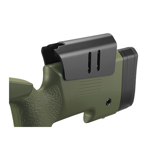マクミランタイプ・ストック:樹脂製のストックは、実物を採寸して形状や質感のリアリティを追求。ストック後部のチークピースは、本物同様に上下調整とスクリューの左右入れ替えが可能です。また、バットプレートの厚さが変えられるスペーサー4枚も付属し、射手の体格に合わせたセッティングを行うことができます。