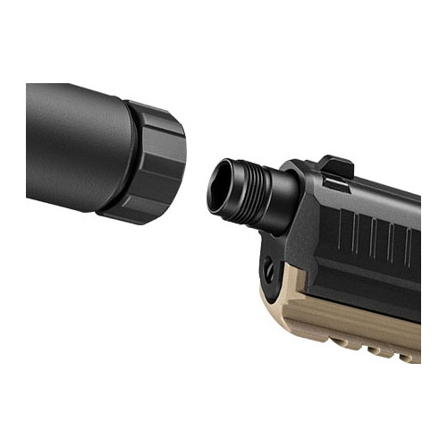 ●専用サイレンサー付属:作動性能に干渉しにくい、軽量なアルミ製専用サイレンサーが付属。内部の吸音スポンジが、前方方向の発射音を低減します。また、サイレンサー装着に十分な耐久性をもたせるため、金属と樹脂で構成されたアウターバレルを採用。サイレンサー未装着時にマズルのネジ部を保護するため、マズルプロテクターも付属しています。※付属の専用サイレンサー以外のマズルオプションには対応していません。