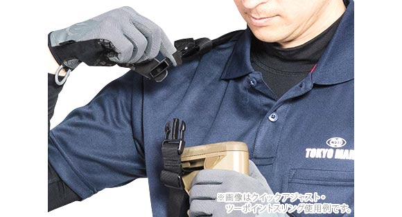 バックルで脱着可能:両端に搭載したバックルにより、ワンタッチでスリングのかけ外しが可能。身に付けた装備品が多い時でも、スリング付きのエアソフトガンをカンタンに脱着することができます。