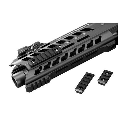 ●M-LOKレイルシステム:剛性が高いアッパーレシーバー一体型のアルミ切削ハンドガードに、幅20mm(ピカティニー規格)の最新レイルシステム「M-LOK(エム-ロック)」を採用。必要な部分にだけレイルを増設可能なハンドガードはスリムで扱いやすく、肉抜きによる軽量化もされています。M-LOKレイルは3スロット、5スロット、7スロットの3種類が各1枚付属。付属の六角レンチで簡単に脱着可能です。