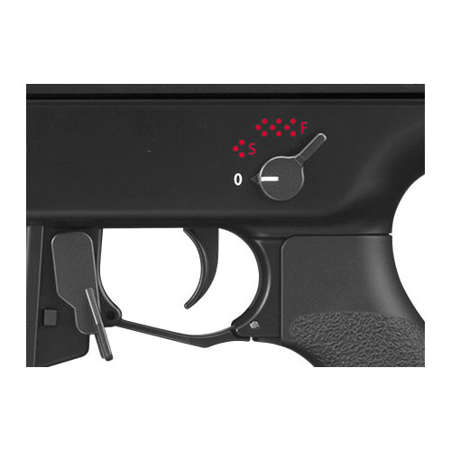 ●フル/セミオート切替式:1回トリガーを引くと1度だけ3発同時発射するセミオート発射と、トリガーを引いている間、秒間約10射のサイクルで3発同時発射し続けるフルオート発射が可能。ボディ側面のセレクターで、セミオートとフルオートの切り替えを行うことができます。