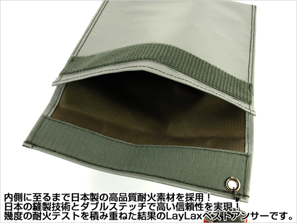 結果、現在市場に流通する安価なものや海外製品のセーフティバッグでは、発火や爆破が起きた際、バッグの溶解や外皮の延焼、爆発時の破裂等に耐えるものがほとんど無く、セーフティバッグとしての安全性能が不足している現状を知りました。 また、当社がリチウムポリマーバッテリーをリリースするのに、安価なセーフティバッグでは不確実な商品を世に送り出すことになる危機感がありました。 そこで安価なものより安全を第一に考え、生地選びから使用する糸は勿論、縫製まで様々な素材を調査&発火テストを繰り返し行った結果、最高のセーフティバッグを開発!