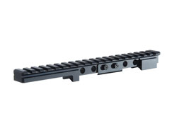 そこで、純正品よりも背が高く長いマウントベースを作ってみました。(レシーバー上面からマウントベース上面までの高さは17?、マウントの全長は200?です) これなら大型のスコープもマウント出来ますね(^^) 小型のスコープやダットサイトを使用する場合は、長さの余裕そ活かしてスコープシールドを取付けられます!