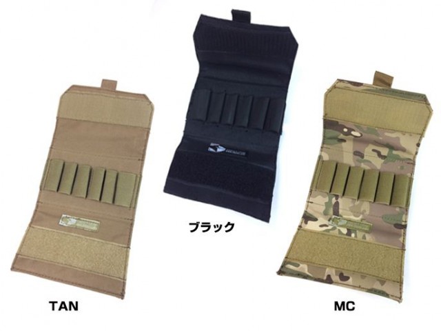 ショットガンシェルを収納できるポーチで、広げたままでも畳んでケース状にしても使用できます。