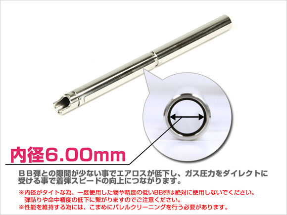 ※内径がタイトな為、一度使用した物や精度の低いBB弾は絶対に使用しないでください。弾詰りや命中精度の低下に繋がりますのでご注意ください。