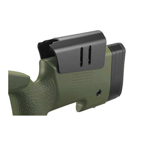 ●マクミランタイプ・ストック:樹脂製のストックは、実物を採寸して形状や質感のリアリティを追求。ストック後部のチークピースは、本物同様に上下調整とスクリューの左右入れ替えが可能です。また、バットプレートの厚さが変えられるスペーサー4枚も付属し、射手の体格に合わせたセッティングを行うことができます。