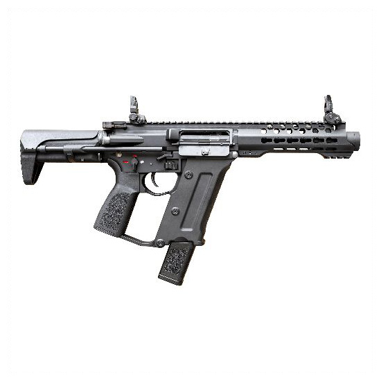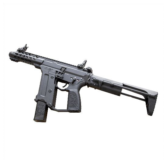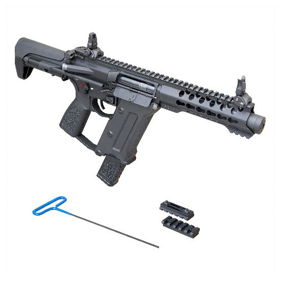 ボディは剛性の高いアルミ合金製で、精密なフリーフロートバレル型のKEYMODレイルを採用(変換マウント2個付属)。樹脂製のPTS社製バックアップサイトや、スリムで超軽量の多段数マガジンなどの構成により、携帯性と扱いやすさを突き詰めたサイズ感に仕上げました。