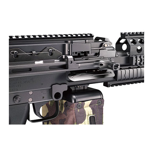 ●ベルトリンクのギミック:本体にセットしたマガジンからベルトリンクを引き出し、本体のフィードカバーを開いてベルトリンクをセット。金属製のダミーカートリッジを連ねたベルトリンクは、発射作動と連動してまるで給弾しているかのように動きます。