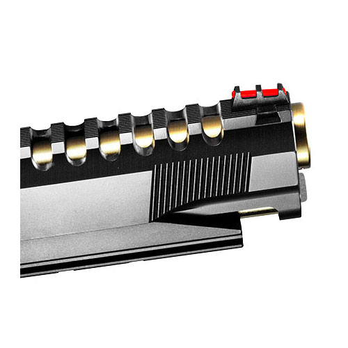 ●ゴールドのアクセント:アウターバレル、ハンマー、サムセフティ、トリガー、グリップスクリューは、拡張高いゴールドに。ブラックボディとのコントラストが際立ちます。