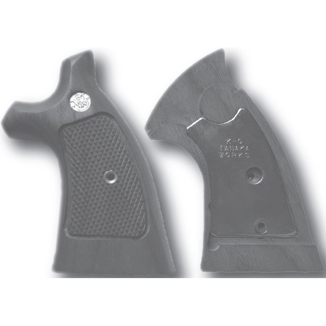 第一弾はM19 4inch やM10 4inch など、グリップ形状がスクエアタイプのK フレームに装着可能なオーバーサイズ・チェッカーグリップです。質の良いブラックウォールナット材のみを厳選使用し、形状の再現はもちろん、仕上げ、佇まいはオリジナルの持つイメージを残しつつ、より高品質なトイガンを楽しむためのグリップを製作しました。