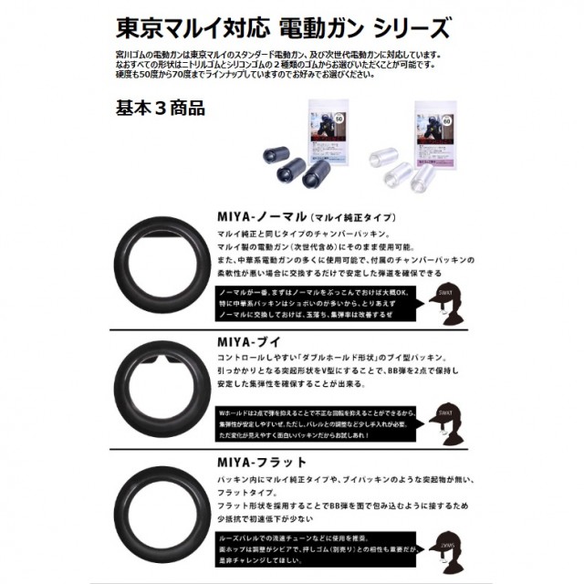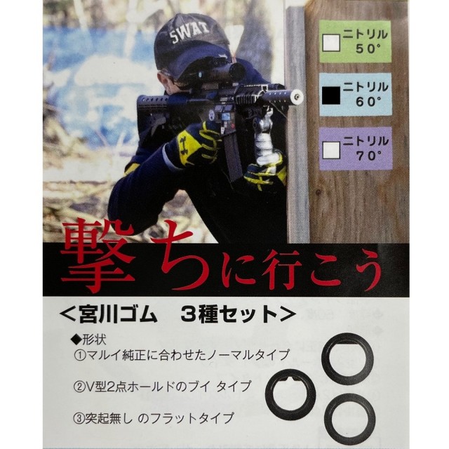 ニトリルゴム製硬度60度、形状3種(東京マルイ純正・ブイ・フラット)各1個のセットとなります。