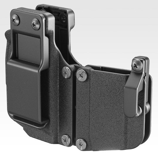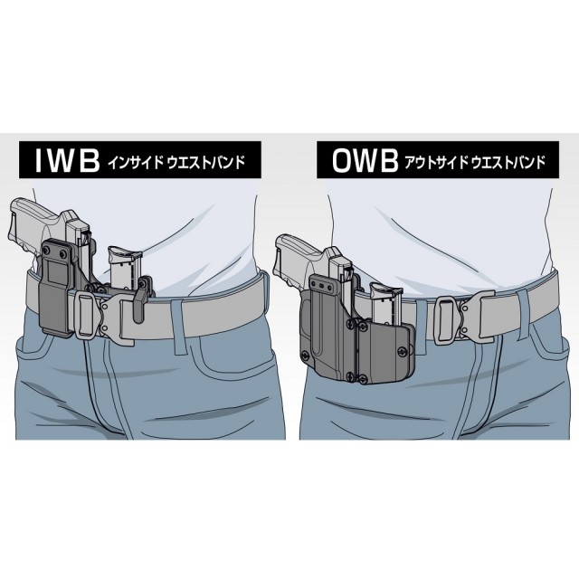 張り出しが少なく秘匿性に優れたIWB(インサイドウエストバンド)、体への接触が少なく操作性の良いOWB(アウトサイドウエストバンド)に両対応。また、組替えによって右利き、左利きにも対応します。