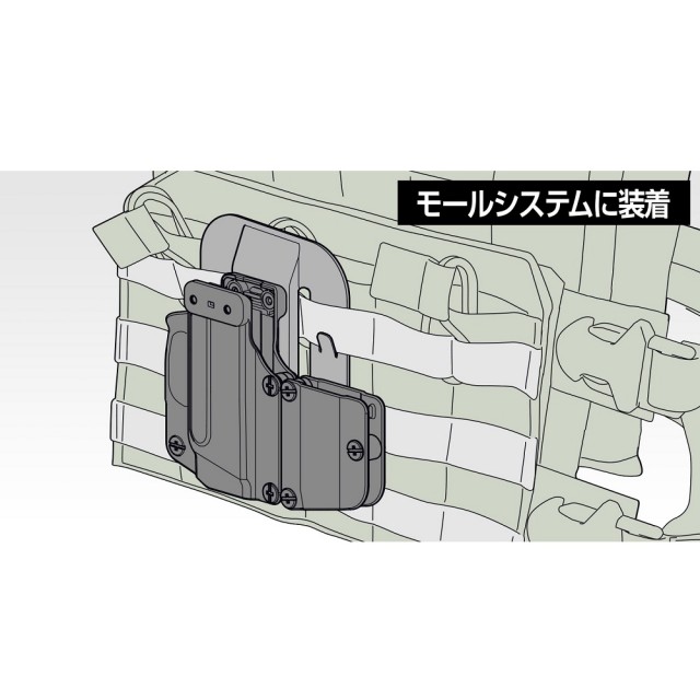 装着方法:インサイド・ウエストバンド(右利き/左利き/ガンホルスター単体可)、アウトサイド・ウエストバンド(右利き/左利き/ガンホルスター単体可)、モールシステム(ガンホルスター単体可)