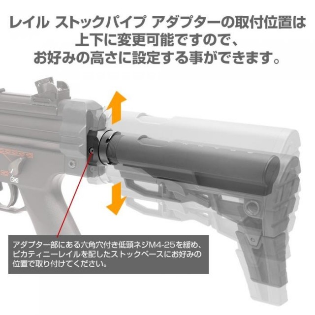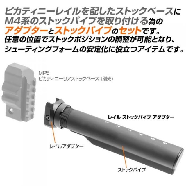ピカティニーレイルを配したストックベースにM4系のストックパイプを取り付ける為のアダプターとストックパイプのセットです。