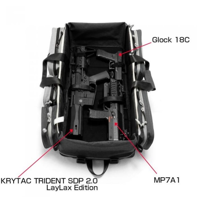 ●電動ガンを2本収納する際は、縁のファスナーを開けマチを広げて収納出来ます。