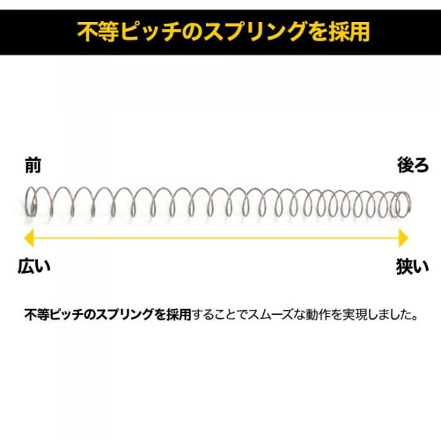 さらに不等ピッチのスプリングを採用することでスムーズな動作を実現しました。また、スプリングガイドの長さをショート・ロングの2段階に調整でき、好みに合わせて選ぶことが出来ます。