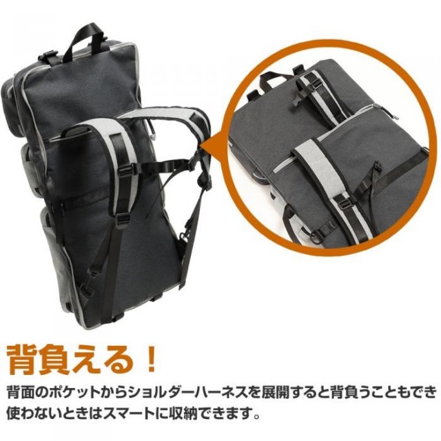 ●背面のポケットからショルダーハーネスを展開すると背負うこともでき、使わないときはスマートに収納できます。