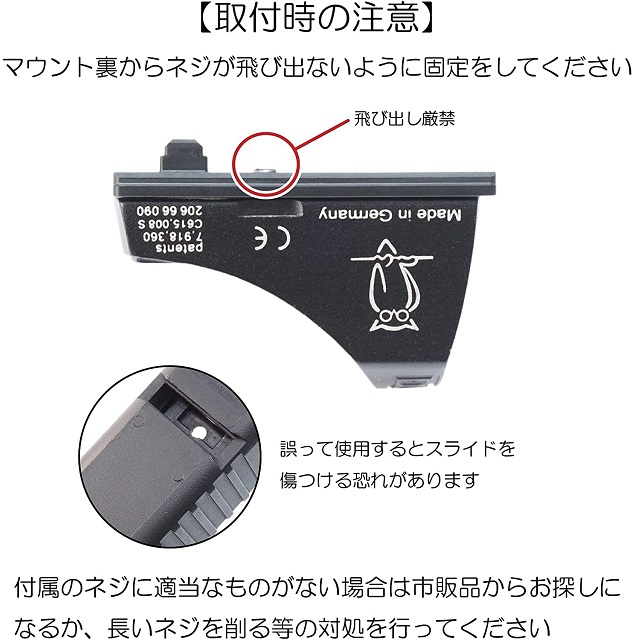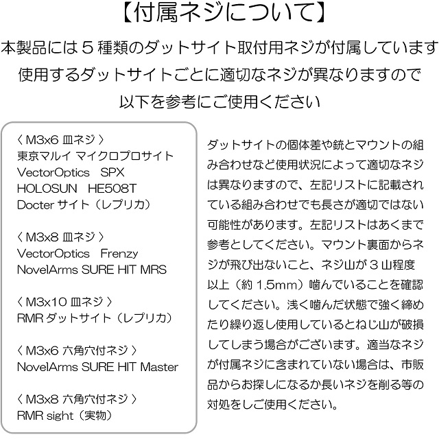 ・ダットサイトの個体差や銃とマウントの組み合わせなど使用状況によって適切なネジはことなりますので、画像のリストに記載されている組み合わせでも長さが適切ではない可能性があります。画像のネジリストはあくまで参考としてください。マウント裏面からネジが飛び出さないこと、ネジ山が3山程度(約1.5mm)以上噛んでいることを確認してください。浅くかんだ状態で強く締めたり繰り返し使用しているとネジ山が破損してしまう場合がございます。適切なネジが付属ネジに含まれていない場合は、市販品からお探しになるか長いネジを削る等の対処をしてご使用下さい。
