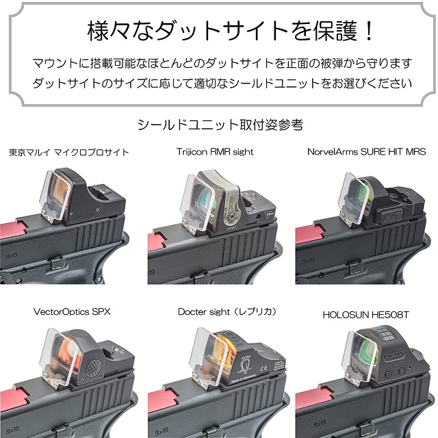 シールドユニット対応メタルマルチマウントに取り付けることで、マウントに搭載しているマイクロダットサイトを被弾から守ることが出来ます。