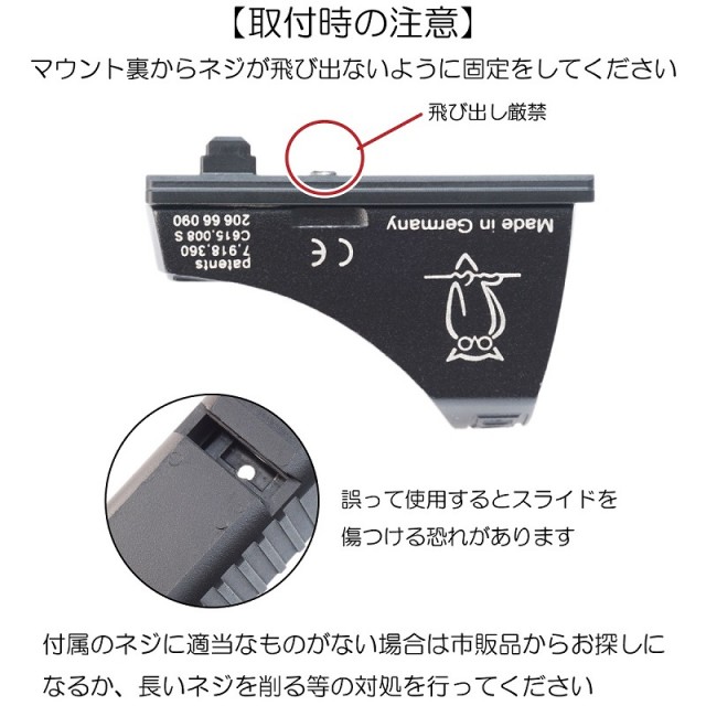 ・ダットサイトの個体差や銃とマウントの組み合わせなど使用状況によって適切なネジはことなりますので、画像のリストに記載されている組み合わせでも長さが適切ではない可能性があります。画像のネジリストはあくまで参考としてください。マウント裏面からネジが飛び出さないこと、ネジ山が3山程度(約1.5mm)以上噛んでいることを確認してください。浅くかんだ状態で強く締めたり繰り返し使用しているとネジ山が破損してしまう場合がございます。適切なネジが付属ネジに含まれていない場合は、市販品からお探しになるか長いネジを削る等の対処をしてご使用下さい。
