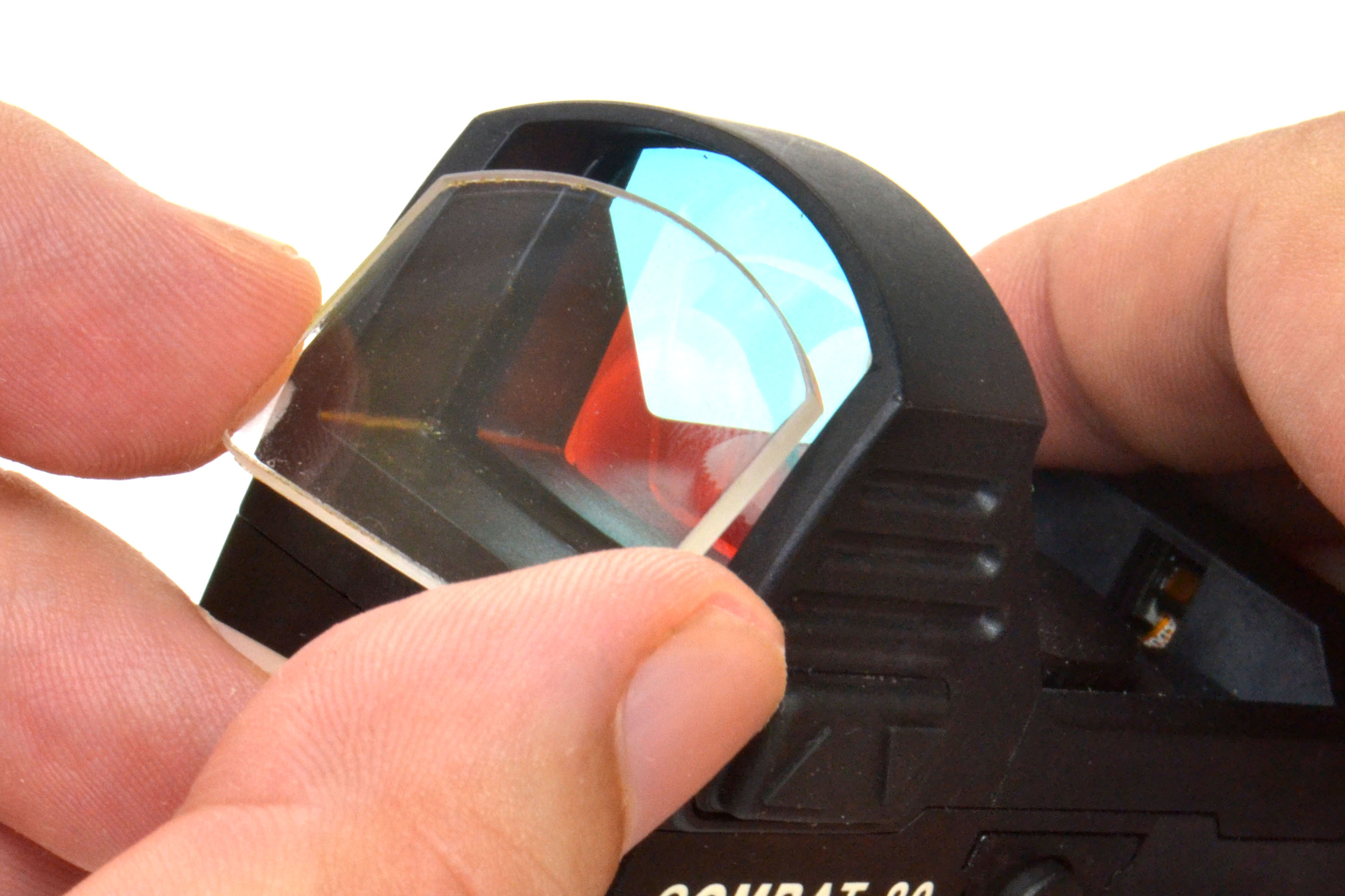 保護シートを剥がしたレンズプロテクターの上部(湾曲した部分)を、COMBAT80のレンズガードに下から差し込みます。※写真のCOMBAT80用プロテクターは、端面を磨き処理してあります。磨き処理しなくても取り付けは可能です。