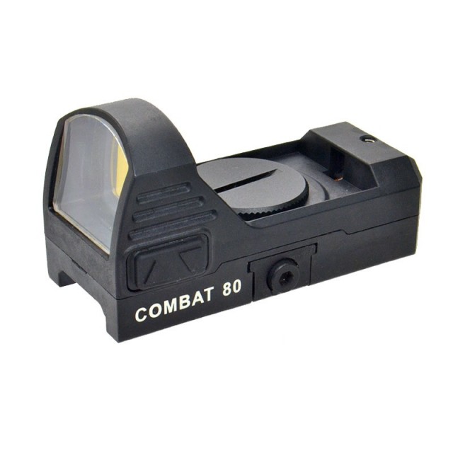 極めて硬い(叩くと金属みたいな音がする)特殊な樹脂で作られた、軽量で頑丈なドットサイト「COMBAT80」。ON/OFFや明るさ調整を行うのが従来のドットサイトにありがちなアナログのダイヤルではなく、デジタルスイッチになっているため、スイッチを押すだけで「前回OFFにしたときと同じ明るさで点灯」してくれる点、「うっかりつけっぱなしにして電池消耗」の心配がない点など、ワンランク上の使いやすさが魅力です。しかも実売価格が6000円前後と超リーズナブル! オープンタイプの軽量ドットサイトでは大ヒット作となっています。