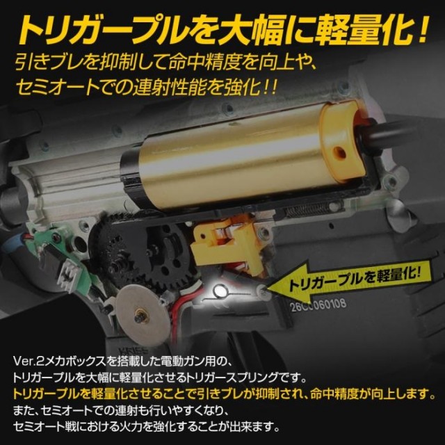 Ver.2メカボックスを搭載した電動ガン用の、トリガープルを大幅に軽量化させるトリガースプリングです。トリガープルを軽量化させることで引きブレが抑制され、命中精度が向上します。また、セミオートでの連射も行いやすくなり、セミオート戦における火力を強化することが出来ます。