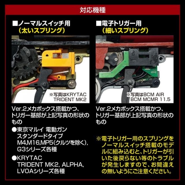 ※電子トリガー用のスプリングをノーマルスイッチ搭載のモデルに組み込むと、トリガーが引いた後戻らない等のトラブルが発生しますので、お間違えの無いようにご注意ください。