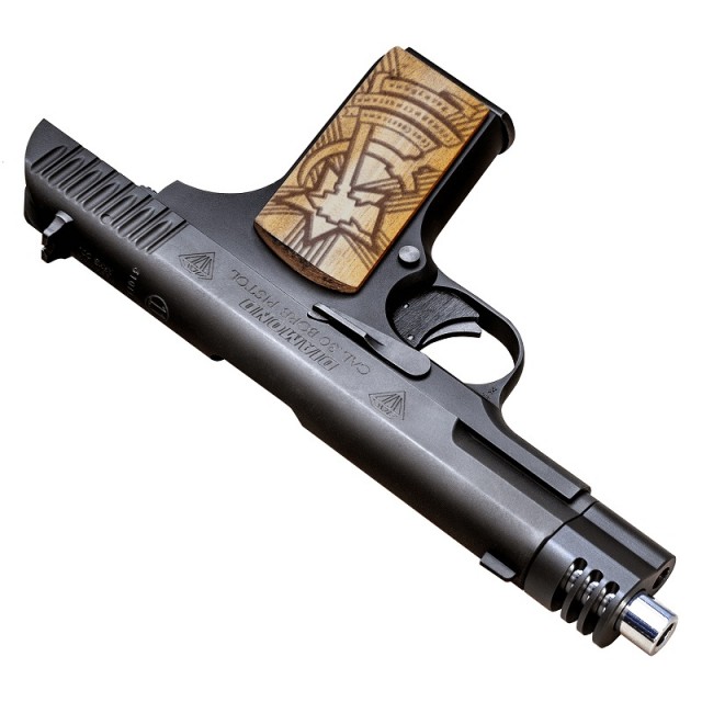 プレーンウッドに焼印されたような風合いがユニークな木製グリップをはじめ、近代的な「セーフトリガー」やアルミ合金製コンプ、クロームメッキ仕様のアウターバレルなどをフル装備し、さらにコンプ無しのスタイルや旧型マグベースへの変更も可能な豪華版です。
