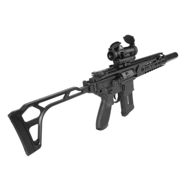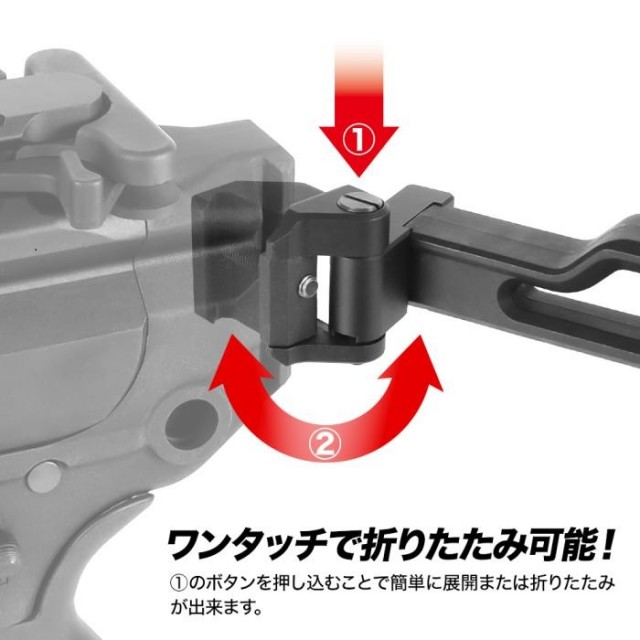 SIG MCX等の銃の後部にピカティニーレイルを装備している機種や、当社製ピカティニーリアストックベース(別売)への装着が可能なフォールディングストックです。ストック基部には軽量なアルミ合金、ストック本体には樹脂を採用することで、装備する銃のトータル重量の増加を抑えています。また、ワンタッチでストックを折り畳むことが可能で、ガンケース、バッグ等への収納等に便利です。