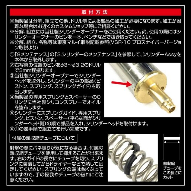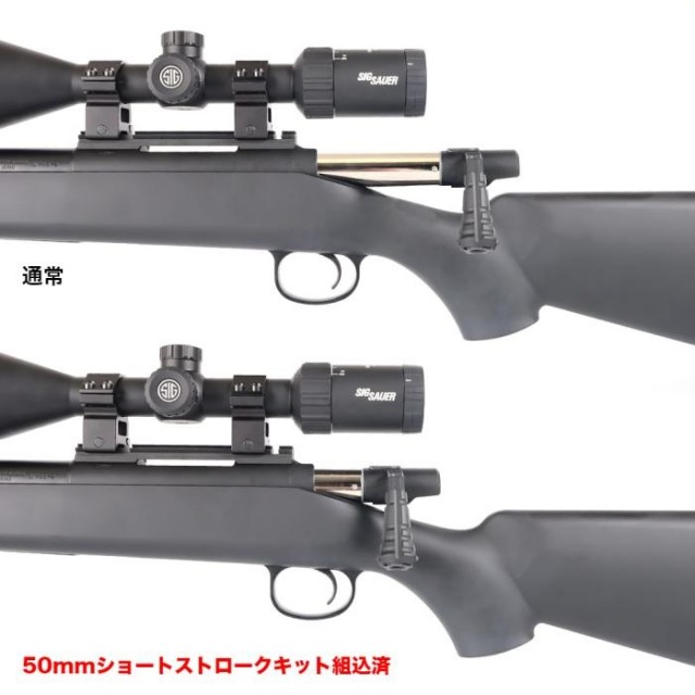 VSR-10のボルトストロークを可能な限り短縮し、速射性能を強化するキットです。純正の状態からボルトのストロークを50mm短縮!圧倒的な速さでコッキングが可能になります。また、専用のスプリングを使用することで、シリンダー容量の減少による初速の低下を抑えられます。