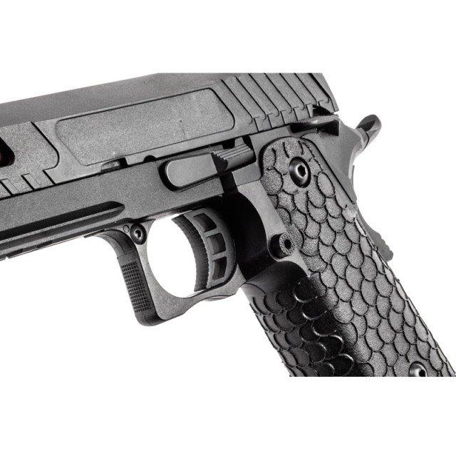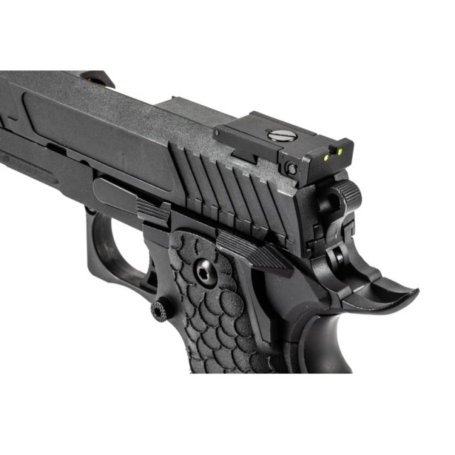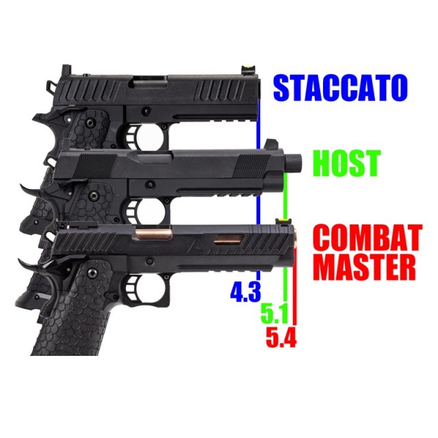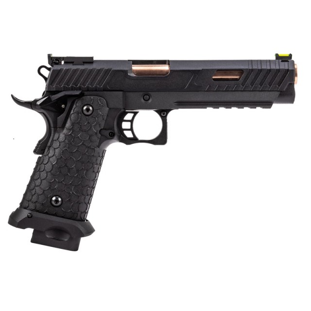 この名銃をモチーフとした、BATON airsoft最新のCO2GBB、BS-COMBAT MASTERがついに登場。日本の法規制に適合した強化樹脂スライドは、ブロンズ仕上げのアウターバレルが覗く両側面のポートを始め、実銃の戦闘的なデザインを忠実に再現。ファイバーオプティックサイトは、素早く確実なエイミングを実現し、ショートリコイルキャンセル型の11mm正ネジアウターバレルは、安定した弾道を約束。そしてグリップ表面のドラゴンテクスチャー風モールドは、CO2GBBの強烈なリコイルにも耐えるグリッピングを可能とする。