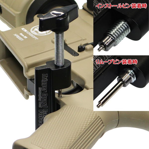 Lピン(ロング:リムーブ用)はトリガーガードを外す時、Sピン(ショート:インストール用)はトリガーガードを組む時に使用します。