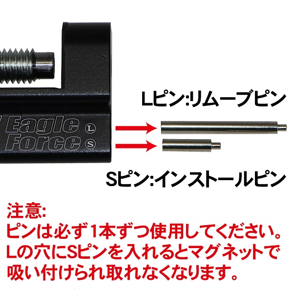 先端凸型加工により固定ピンの中心にフィットしやすいLピン(ロング:リムーブ用2.93X28mm)とSピン(ショート:インストール用2.93X13mm)が付属しています。
