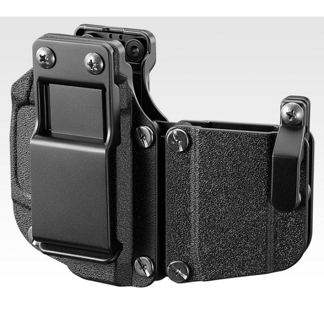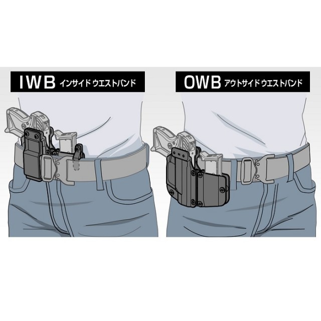 張り出しが少なく秘匿性に優れたIWB(インサイドウエストバンド)、体への接触が少なく操作性の良いOWB(アウトサイドウエストバンド)に両対応。また、組替えによって右利き、左利きにも対応します。
