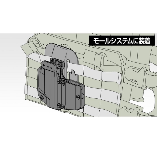 装着方法:インサイド・ウエストバンド(右利き/左利き/ガンホルスター単体可)、アウトサイド・ウエストバンド(右利き/左利き/ガンホルスター単体可)、モールシステム(ガンホルスター単体可)