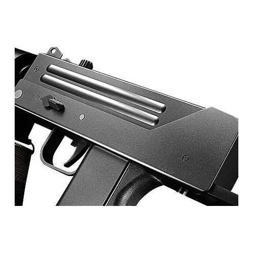 とことん無駄をはぶいたインパクトのあるフォルム、そして金属の質感を思わせる表面のブラスト仕上げにより、マック10のもつ質実剛健なイメージを演出。そしてマック10に欠かせない2つのアクセサリーが、エアソフトガンであってもその効果を発揮します。