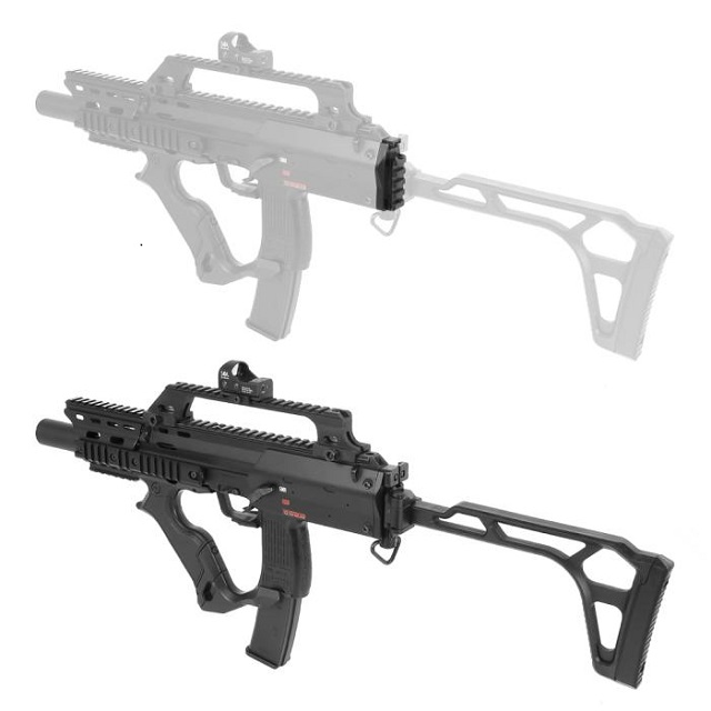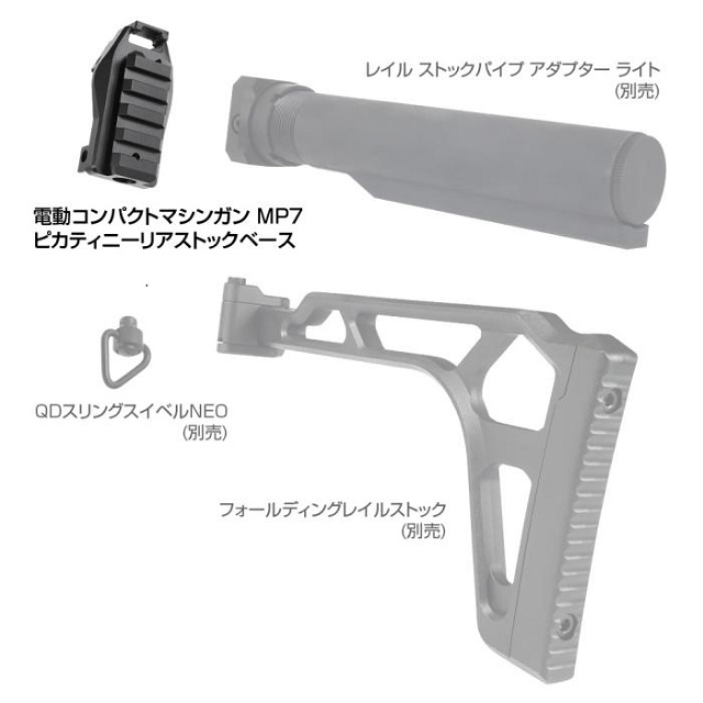 東京マルイ 電動コンパクトマシンガンシリーズ MP7用のピカティニーレイルを配したストックベースです。当製品を取付けることでストックを廃したコンパクトで取り回しの良いピストルスタイルとなり、当社製『レイルストックパイプアダプターライト』を取り付けることでM4系ストックの装着が可能です。また、当社製『フォールディングレイルストック』の取り付けもでき、操作性の向上やお好みのルックスへとカスタマイズできます。